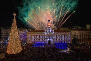 Como cada año los españoles se reunieron en la Puerta del Sol para escuchar las 12 campanadas llevar a cabo la tradición de las 12 uvas al ritmo de las campanadas.