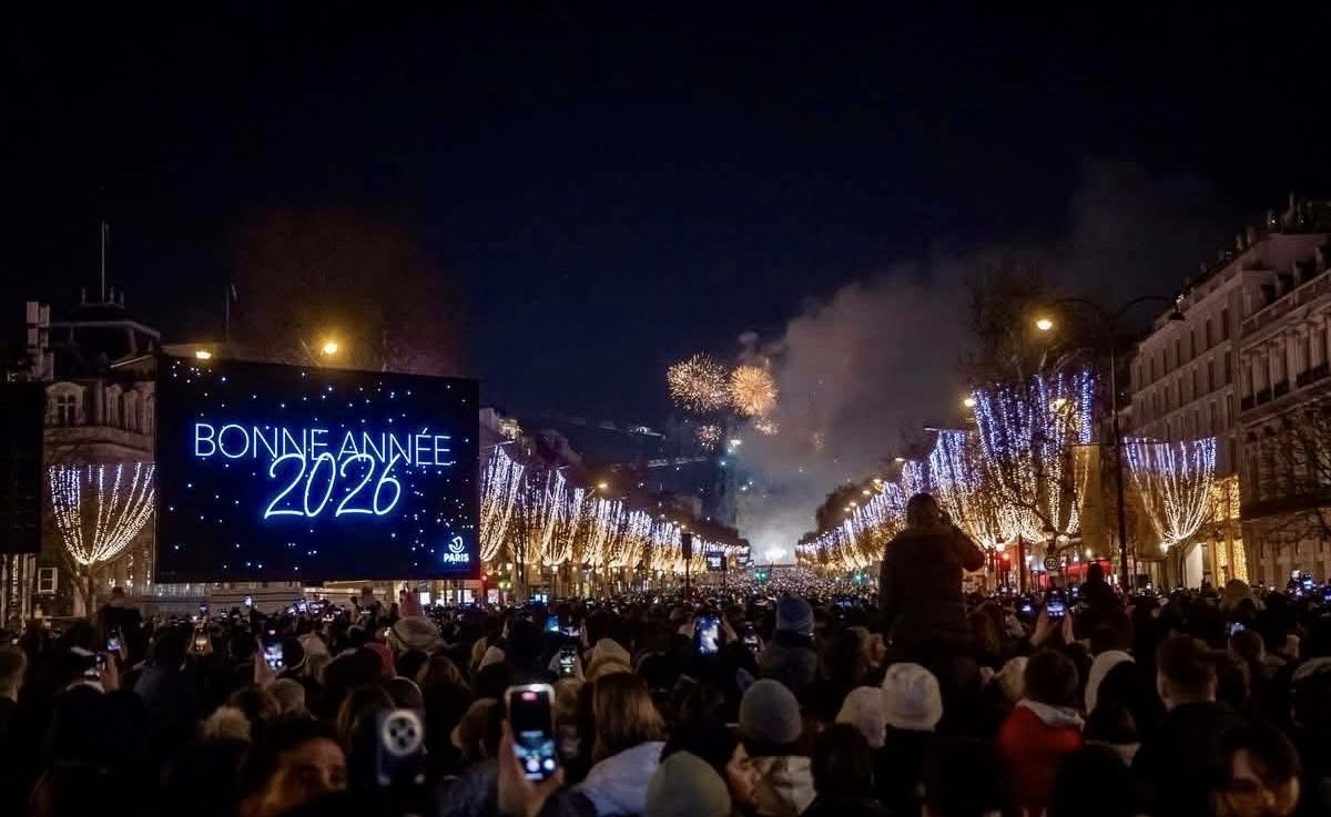 Cientos de parisinos salieron a las calles, a recibir el 2026 con espectáculos de luces, sonido y proyecciones especiales en Campos Eliseos, en donde pudo disfrutar de la música y los fuegos artificiales para para darle la bienvenida al año nuevo.