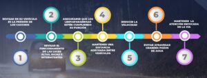 - Revisa tu vehículo para conducir en las horas de trafico, asegurándote que funcionen bien tus limpiaparabrisas y que tus luces enciendan adecuadamente en las horas de tormenta.